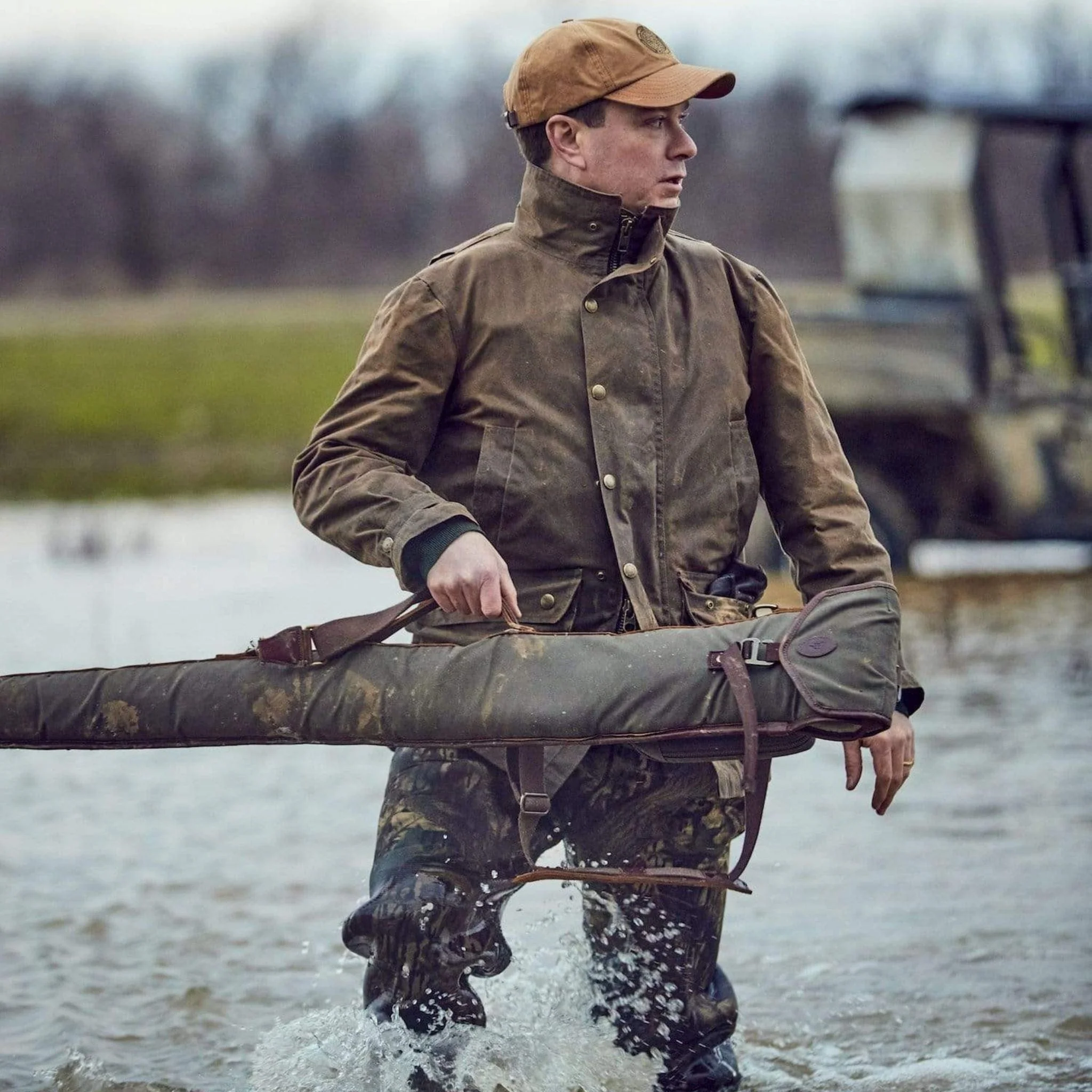 Our Gun Sleeve protects your firearm with a weatherproof Field Canvas exterior, offering the classic look and feel of waxed cotton canvas with the durability and performance of 1000 denier nylon. We lined the interior of this canvas shotgun case with a moisture wicking synthetic sherpa fleece and padded the length with a ¼” ethafoam. The top entry secures tightly with two snap closures and a 9-hook cinch, while splits along either side of the opening offer easy access. The reverse includes a zippered utility pocket and D-ring for vertical storage. An adjustable webbed shoulder strap attaches to d-rings along this canvas shotgun case's spine in regular and shortened configurations. Available in two different lengths: 50” exterior (fits a 49" gun) and 52” (fits a 51" gun).